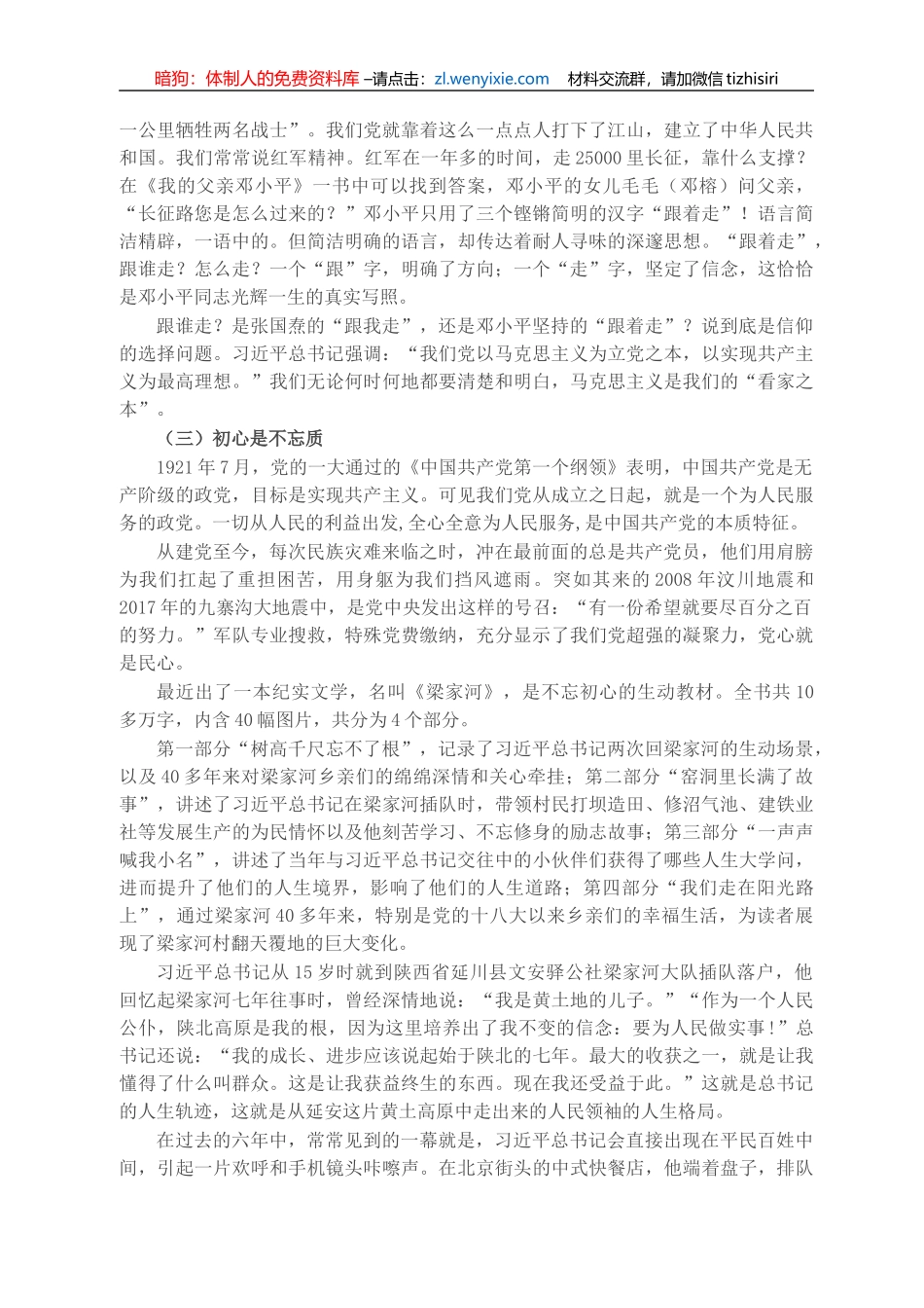 暗狗:体制人的免费资料库 –请点击:zl.wenyixie.com 材料交流群,请加微信 tizhisiri同志们:根据 X 党委党史学习教育活动安排,今天由我和大家分享交流。我交流的题目是《不忘初心使命、永葆青春活力》 ...
