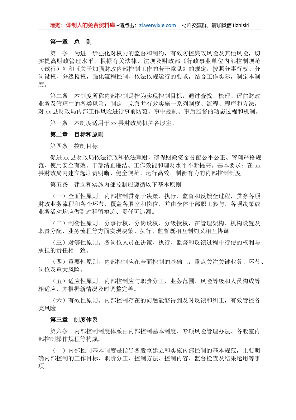 暗狗:体制人的免费资料库 –请点击:zl.wenyixie.com 材料交流群,请加微信 tizhisiri第一章 总 则第一条 为进一步强化对权力的监督和制约,有效防控廉政风险及其他风险,切实提高财政管理水平,根据有关...