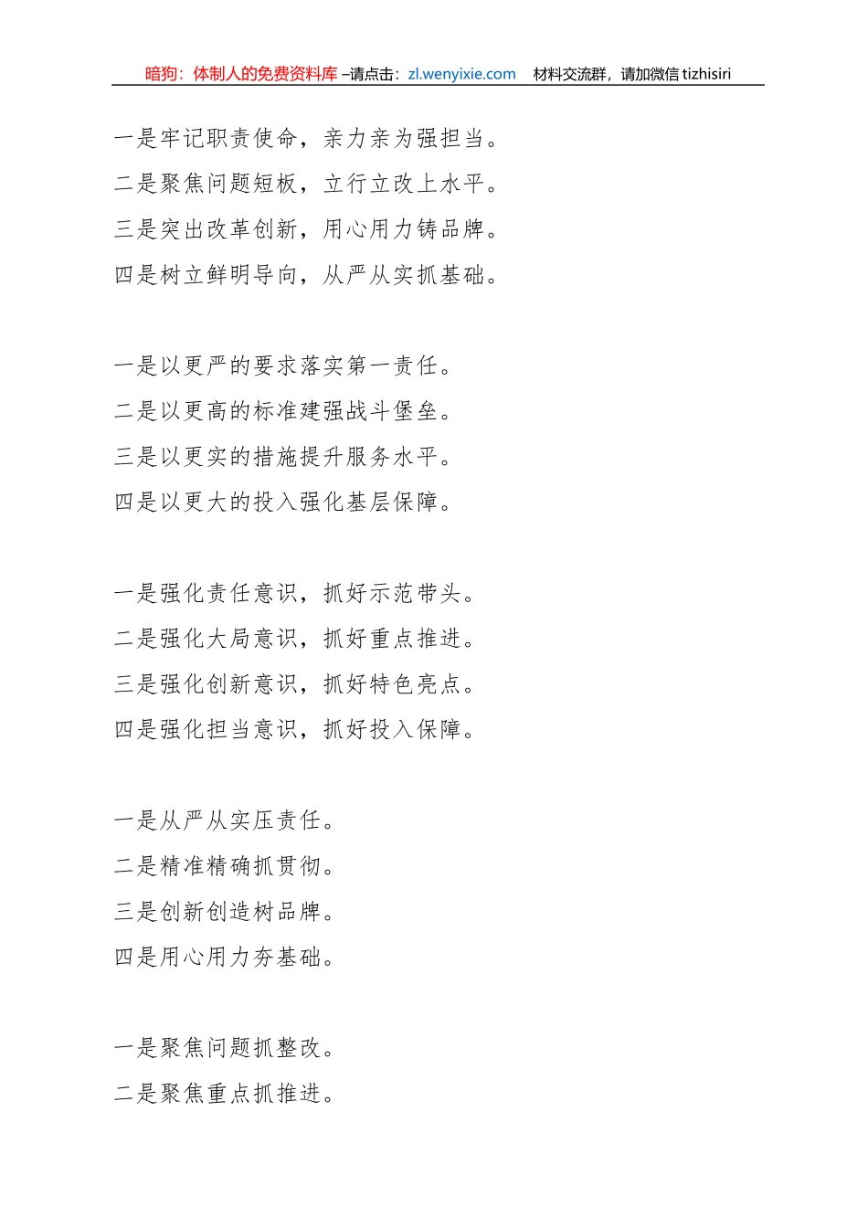 暗狗:体制人的免费资料库 –请点击:zl.wenyixie.com 材料交流群,请加微信 tizhisiri二是聚焦重点抓落实。三是聚焦问题抓整改。四是聚焦保障抓巩固。一是以上率下抓履职。二是聚焦问题促提升。三是务求实效...