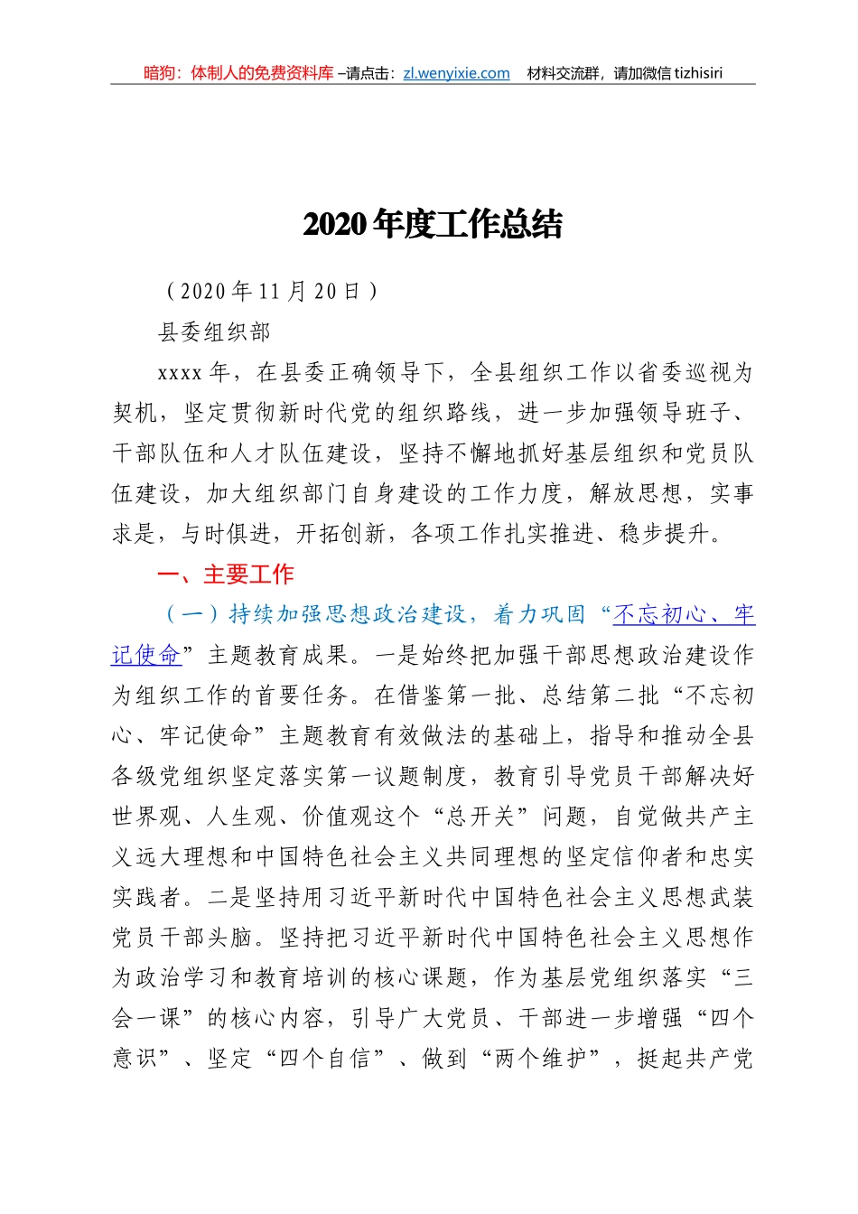 暗狗:体制人的免费资料库 –请点击:zl . wenyixie .com 材料交流群,请加微信 tizhisiri2020 年度工作总结(2020 年 11 月 20 日)县委组织部xxxx 年,在县委正确领导下,全县组织工作以省委巡视...