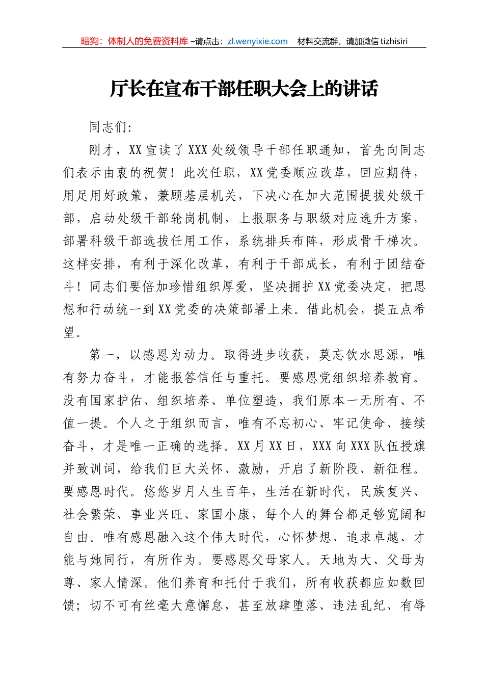 暗狗:体制人的免费资料库 –请点击:zl.wenyixie.com 材料交流群,请加微信 tizhisiri厅长在宣布干部任职大会上的讲话同志们:刚才,XX 宣读了 XXX 处级领导干部任职通知,首先向同志们表示由衷的祝贺!此...