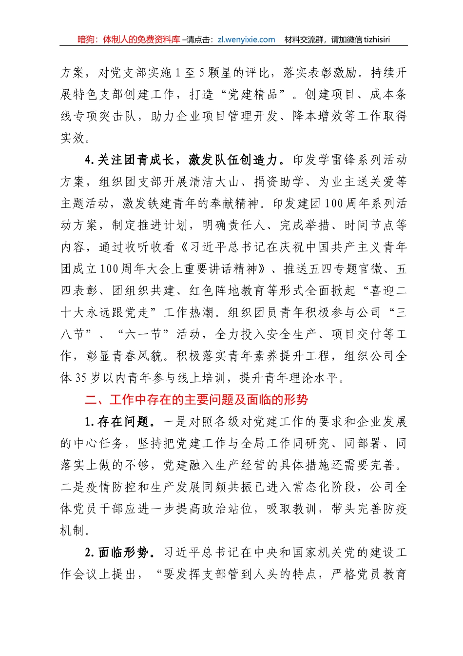 暗狗:体制人的免费资料库 –请点击:zl.wenyixie.com 材料交流群,请加微信 tizhisiri上半年党建工作总结和下半年工作计划一、2022 上半年工作总结1.坚持举旗定向,增强组织向心力。通过党委理论中心组学习...