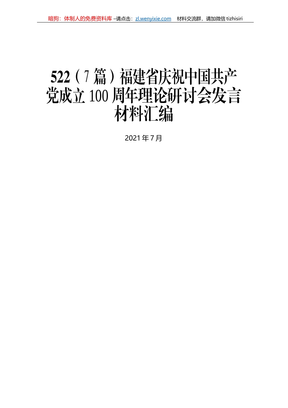 暗狗:体制人的免费资料库 –请点击:zl . wenyixie.com 材料交流群,请加微信 tizhisiri522(7 篇)福建省庆祝中国共产党成立 100 周年理论研讨会发言材料汇编2021 年 7 月目 录1. 中国社会科学院...