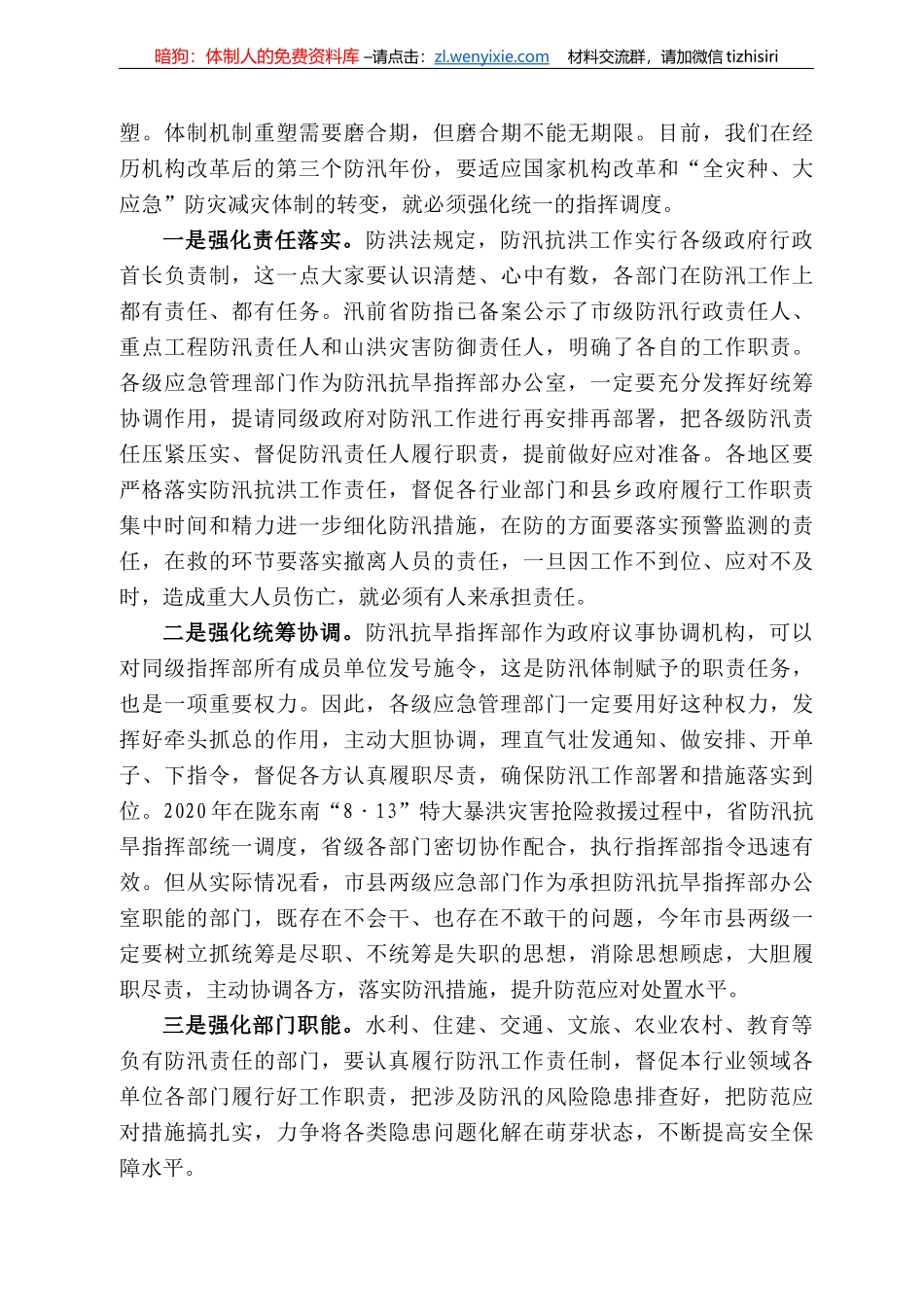 暗狗:体制人的免费资料库 –请点击:zl . wenyixie.com 材料交流群,请加微信 tizhisiri在全省防汛会商会上的讲话甘肃省应急管理厅 黄泽元(2021 年 6 月 18 日)同志们:我们召开这次防汛会商会,主...