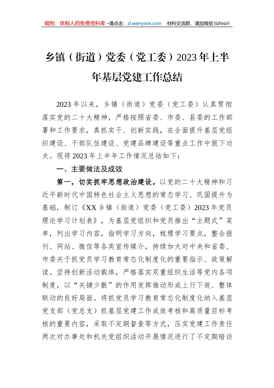 暗狗:体制人的免费资料库 –请点击:zl.wenyixie.com 材料交流群,请加微信 tizhisiri乡镇(街道)党委(党工委)2023 年上半年基层党建工作总结2023 年以来,乡镇(街道)党委(党工委)认真贯彻落实党的...