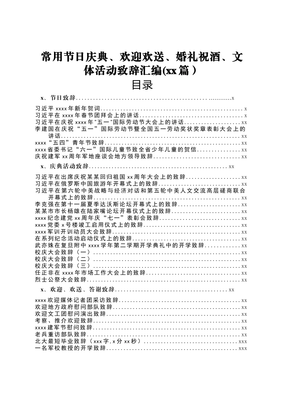 常用节日庆典、欢迎欢送、婚礼祝酒、文体活动致辞汇编(xx 篇)目录x、节日致辞..............................................…………x习近平 xxxx 年新年贺词...............................................