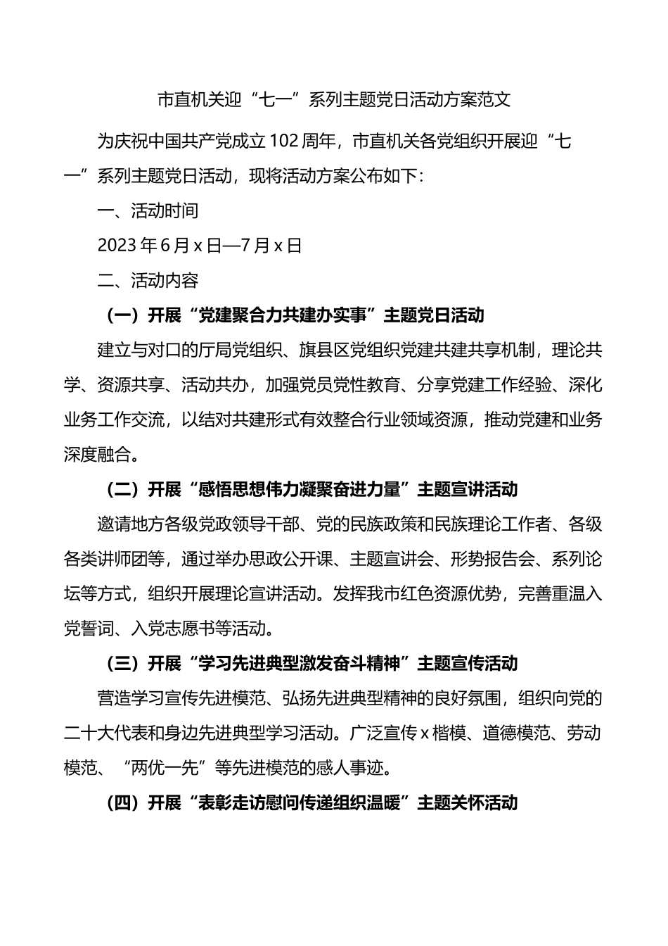 市直机关迎“七一”系列主题党日活动方案范文_第1页