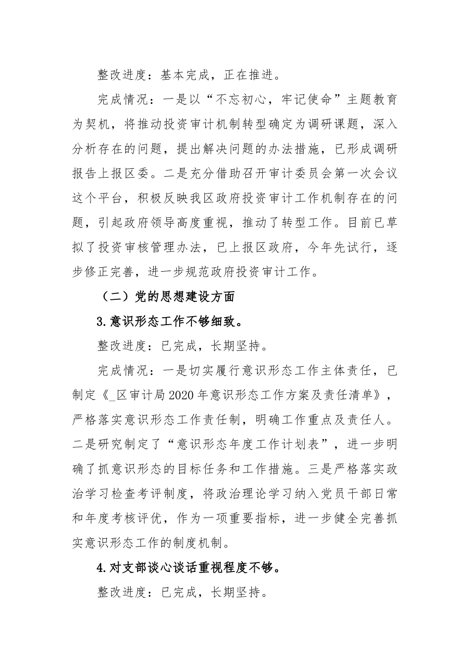 巡察整改进展情况的报告 1根据区委巡察工作领导小组办公室《关于向区审计局党组书记王鹏飞同志的反馈意见》相关意见和要求,本人切实履行党组织第一责任人责任,部署我局巡察整改工作按照整改方案,抓好整改工作...