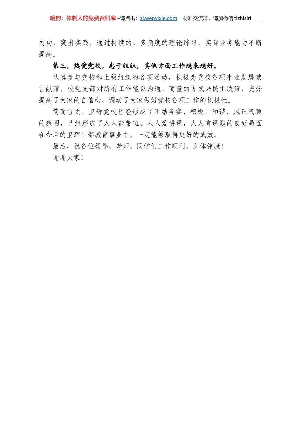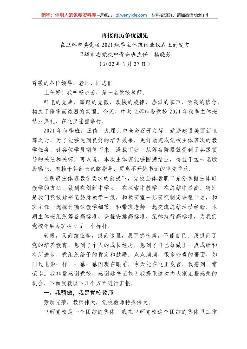 暗狗:体制人的免费资料库 –请点击:zl . wenyixie.com 材料交流群,请加微信 tizhisiri再接再厉争优创先在卫辉市委党校 2021 秋季主体班结业仪式上的发言卫辉市委党校中青班班主任 杨晓芳(2022 年 1...