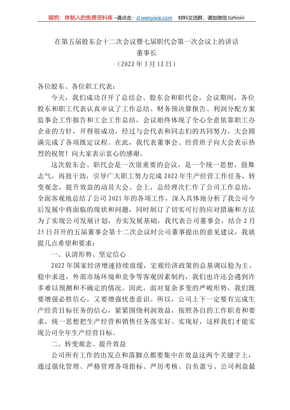 暗狗:体制人的免费资料库 –请点击:zl . wenyixie.com 材料交流群,请加微信 tizhisiri在第五届股东会十二次会议暨七届职代会第一次会议上的讲话董事长(2022 年 3 月 12 日)各位股东、各位职工代表...