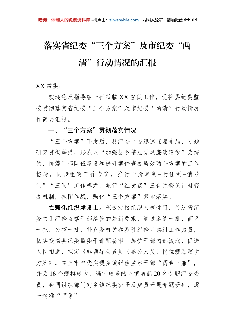 落实省纪委“三个方案”及市纪委“两清”行动情况的汇报_第1页