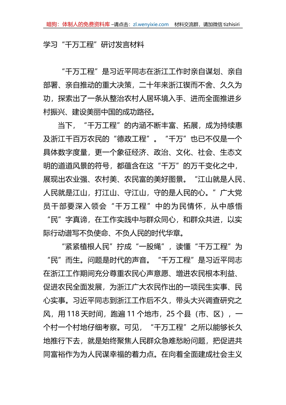 暗狗:体制人的免费资料库 –请点击:zl.wenyixie.com 材料交流群,请加微信 tizhisiri学习“千万工程”研讨发言材料“千万工程”是习近平同志在浙江工作时亲自谋划、亲自部署、亲自推动的重大决策,二十年来...