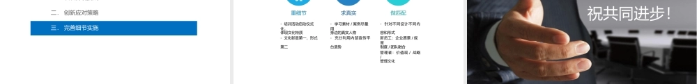 企业文化培训可以这样做目 录一. 认识传统挑战二. 创新应对策略三. 完善细节实施1.1 认识传统挑战走过场打鸡血一言堂目 录一. 认识传统挑战二. 创新应对策略三. 完善细节实施2.1 企业文化宣导发...