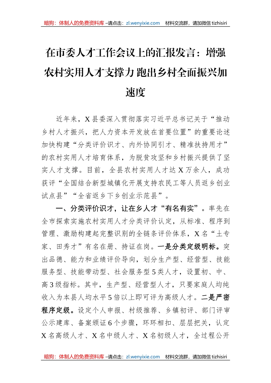 暗狗:体制人的免费资料库 –请点击:zl.wenyixie.com 材料交流群,请加微信 tizhisiri暗狗:体制人的免费资料库 –请点击:zl.wenyixie.com 材料交流群,请加微信 tizhisiri在市委人才工作会议上的汇报发...