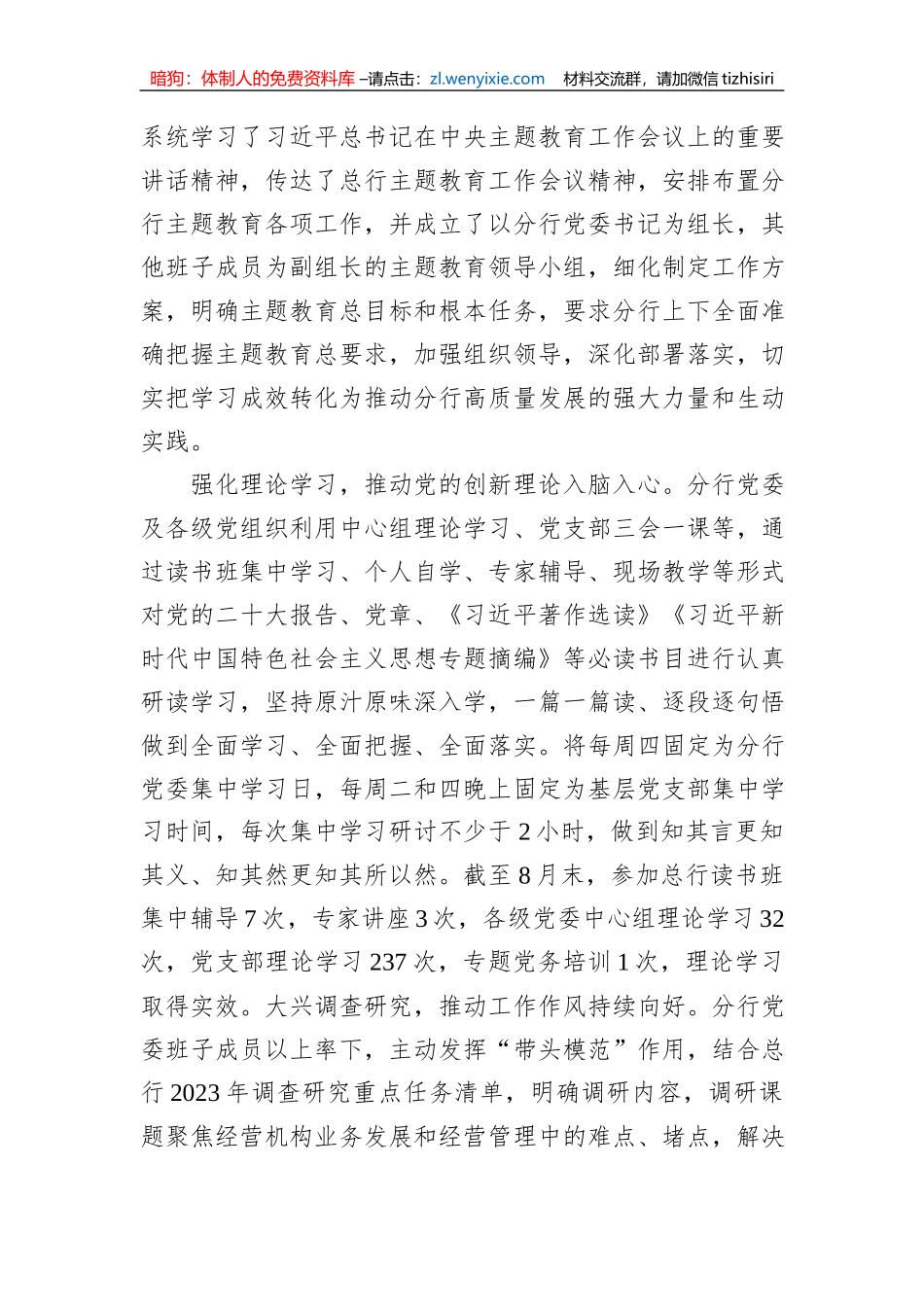 暗狗:体制人的免费资料库 –请点击:zl.wenyixie.com 材料交流群,请加微信 tizhisiri银行学习贯彻 2023 年主题教育工作情况总结自主题教育开展以来,分行党委高度重视,迅速行动,紧紧锚定目标任务,把主...