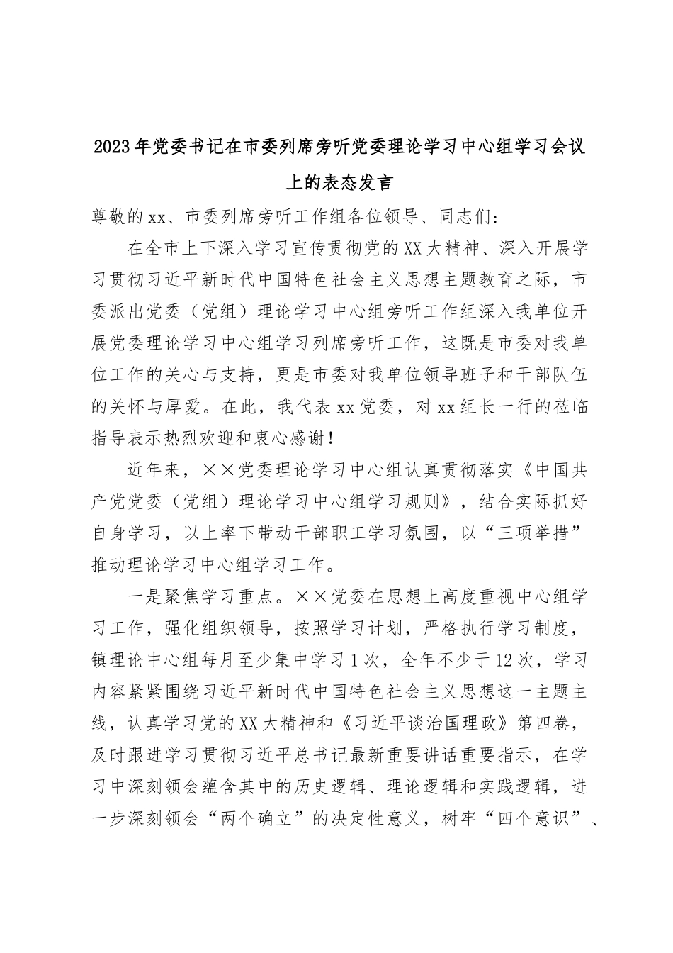 2023年党委书记在市委列席旁听党委理论学习中心组学习会议上的表态发言_第1页