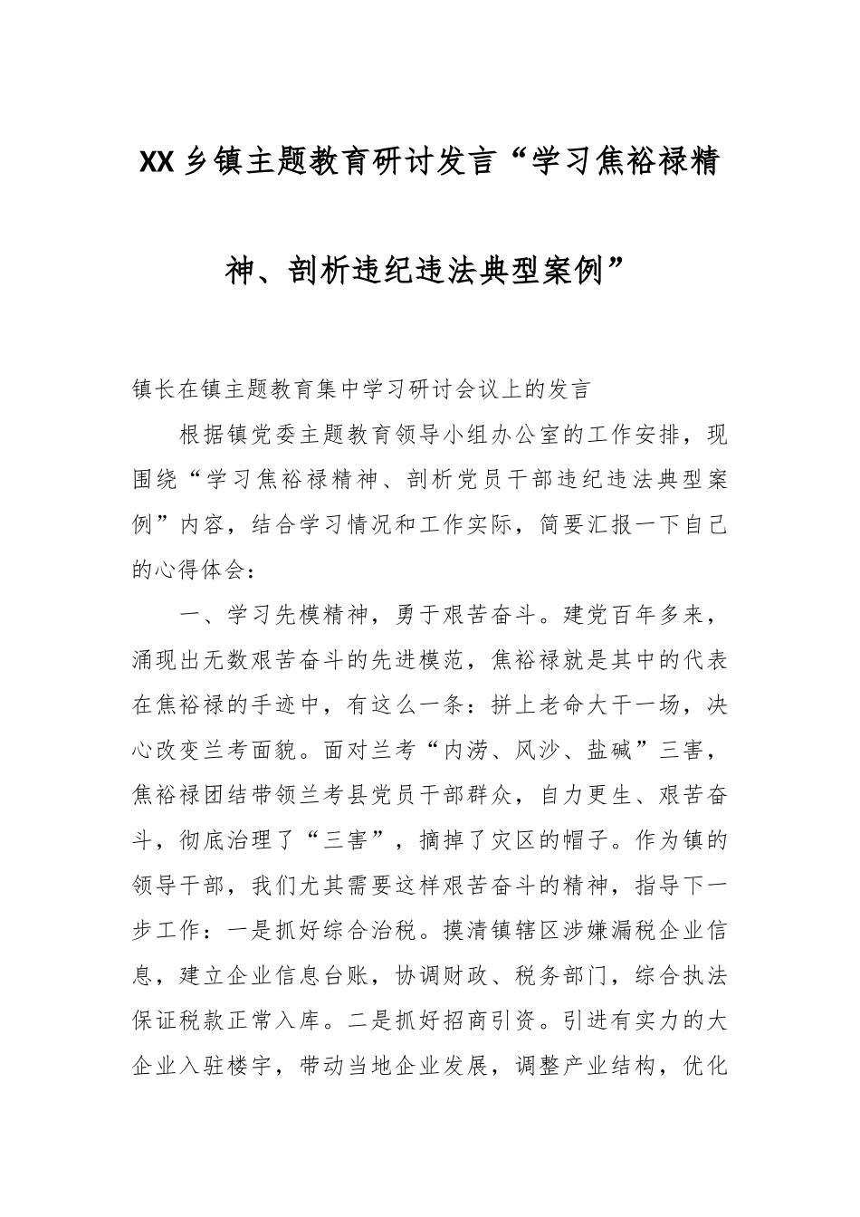 XX 乡镇主题教育研讨发言“学习焦裕禄精神、剖析违纪违法典型案例”镇长在镇主题教育集中学习研讨会议上的发言 根据镇党委主题教育领导小组办公室的工作安排,现围绕“学习焦裕禄精神、剖析党员干部违纪违法典...
