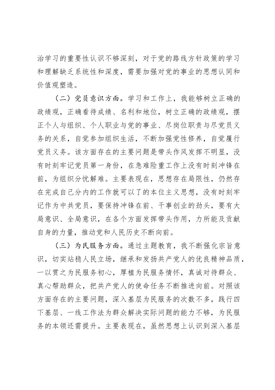 第二批2023年度主题教育组织生活会个人检查材料(党性分析,政治觉悟、党员意识、为民服务、道德操守、对照作用发挥,发言提纲,检视剖析)_第3页