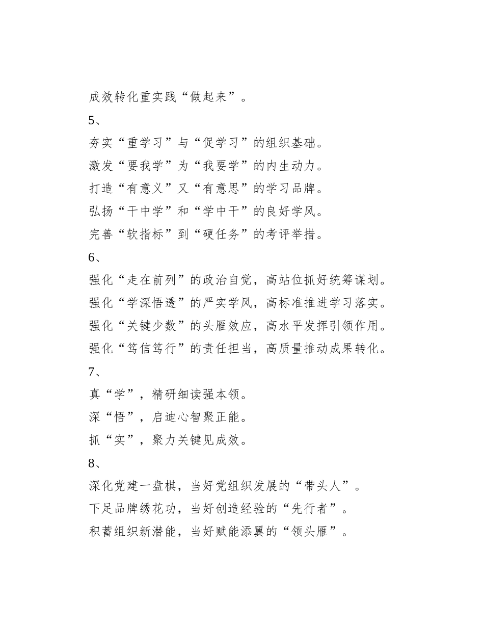 — 1 —党建类、党风廉政建设类材料常用小标题1、坚持大党建,打造强根铸魂更硬内核狠抓大项目,彰显技术支持更强担当深化大合作,推动营收指标更实突破做专大平台,释放国企改革更大动能筑牢大监督,贯彻安全...