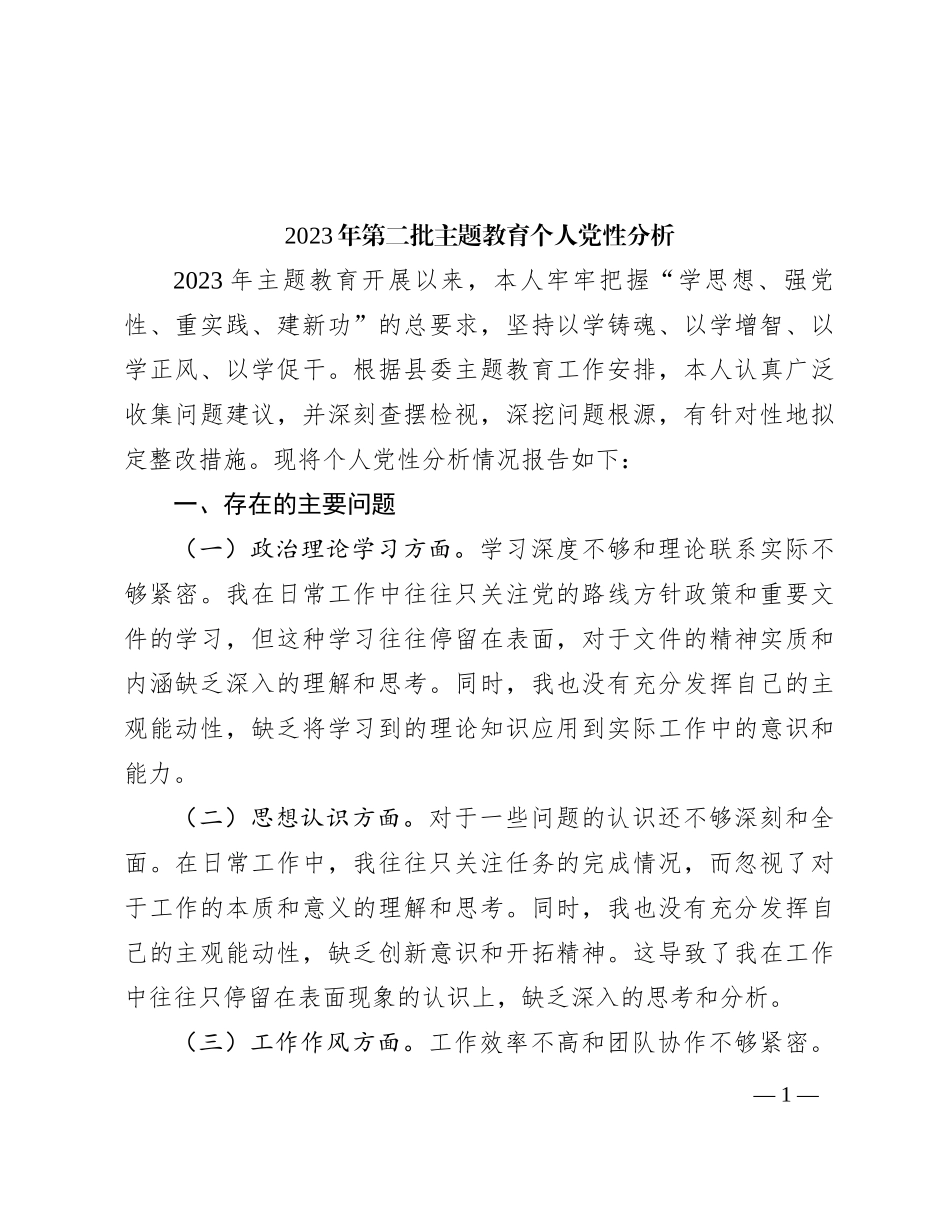 — 1 —2023 年第二批主题教育个人党性分析2023 年主题教育开展以来,本人牢牢把握“学思想、强党性、重实践、建新功”的总要求,坚持以学铸魂、以学增智、以学正风、以学促干。根据县委主题教育工作安排,本...