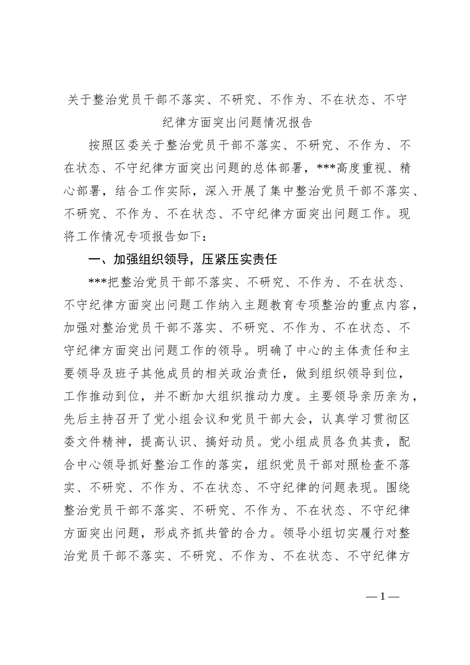 关于整治党员干部不落实、不研究、不作为、不在状态、不守纪律方面突出问题情况报告_第1页
