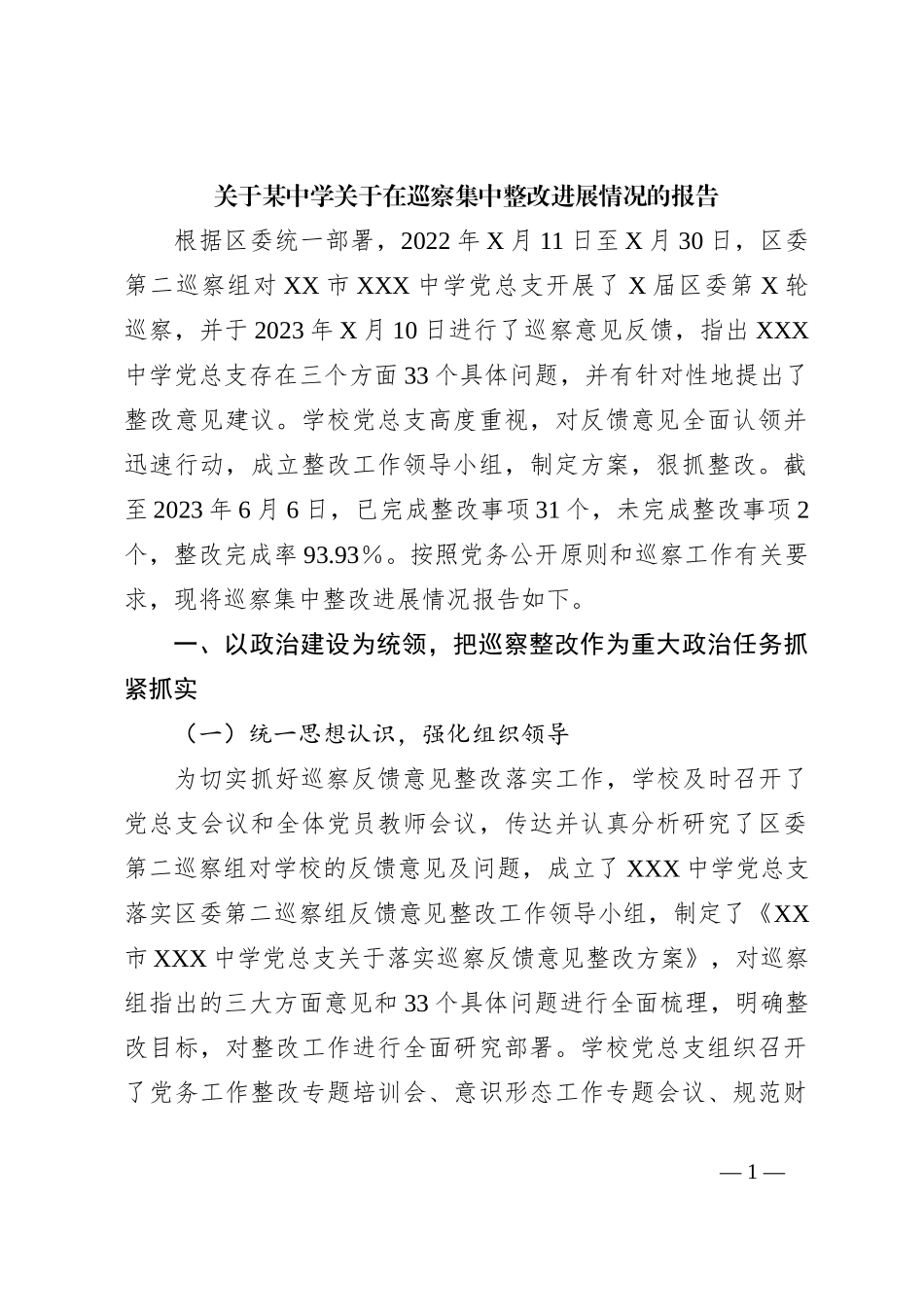— 1 —关于某中学关于在巡察集中整改进展情况的报告根据区委统一部署,2022 年 X 月 11 日至 X 月 30 日,区委第二巡察组对 XX 市 XXX 中学党总支开展了 X 届区委第 X 轮巡察,并于 2023 ...