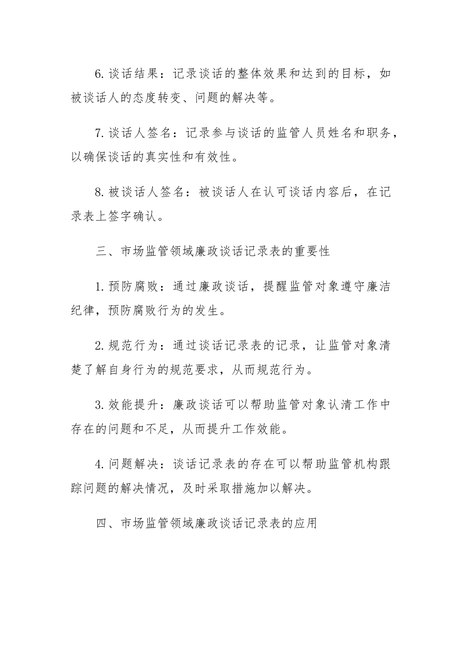 市场监管领域廉政谈话记录表一、引言市场监管领域廉政谈话记录表是指在市场监管机构对相关人员进行廉政谈话时所填写的记录表格。廉政谈话是一种预防腐败的重要方式,通过与相关人员的面对面交流旨在加强廉洁意识...