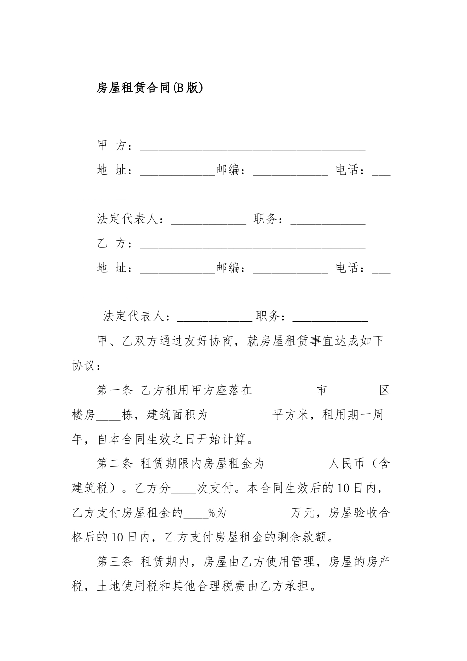 房屋租赁合同(B 版)甲 方:____________________________________地 址:____________邮编:____________ 电话:____________法定代表人:____________ 职务:____________乙 方:________________________...