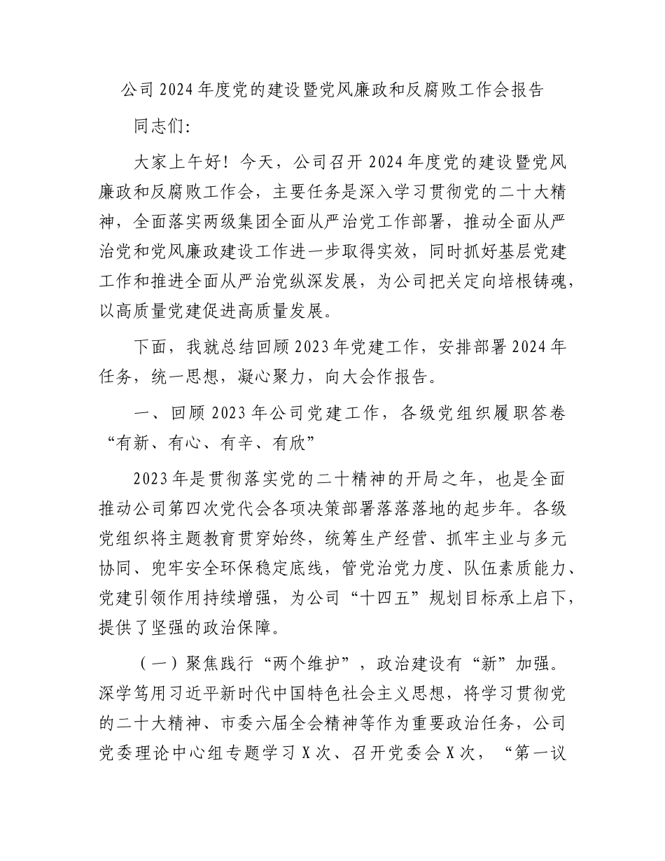 国企2024年度党的建设暨党风廉政和反腐败工作会报告(2023党建总结、2024计划)