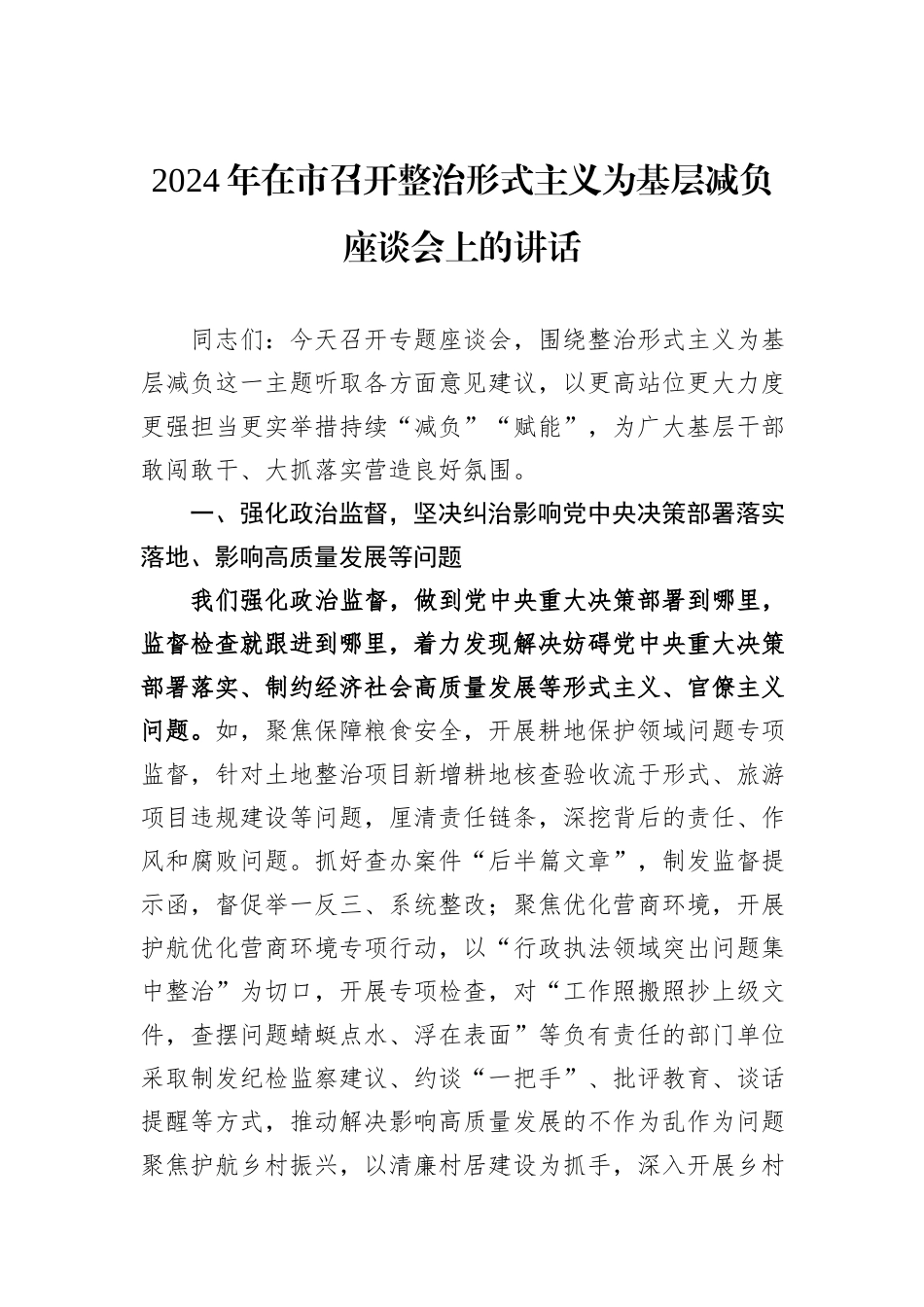 2024年在市召开整治形式主义为基层减负座谈会上的讲话_第1页