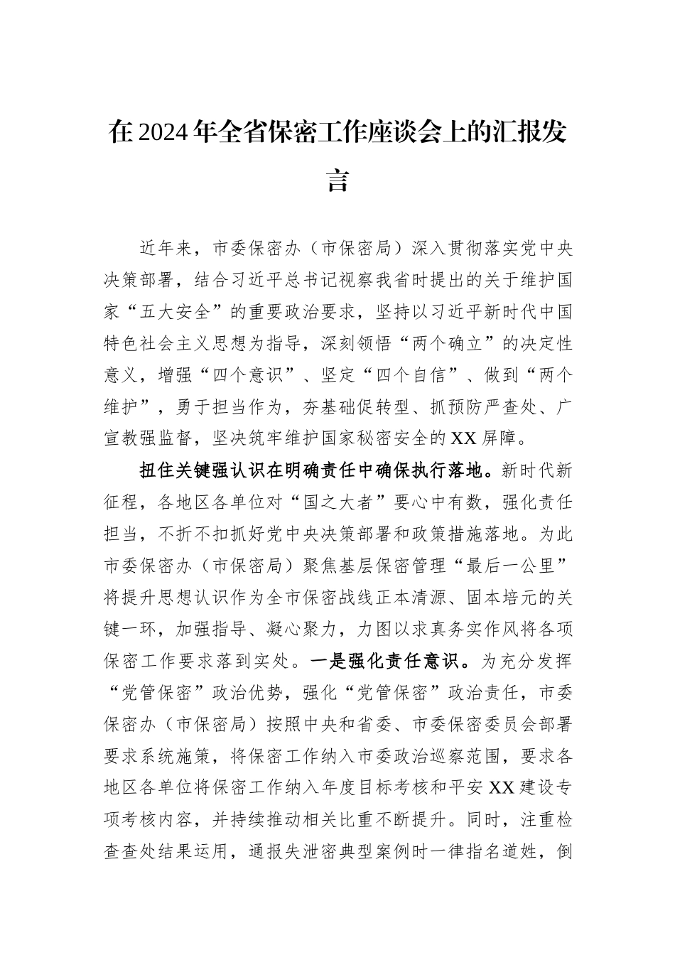 在2024年全省保密工作座谈会上的汇报发言_第1页