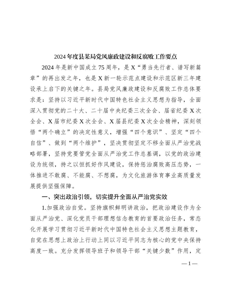 — 1 —2024 年度县某局党风廉政建设和反腐败工作要点2024 年是新中国成立 75 周年,是 X“勇当先行者、谱写新篇章”的再出发之年,也是 X 新一轮示范点建设和示范区新三年建设承上启下的关键之年。县局...