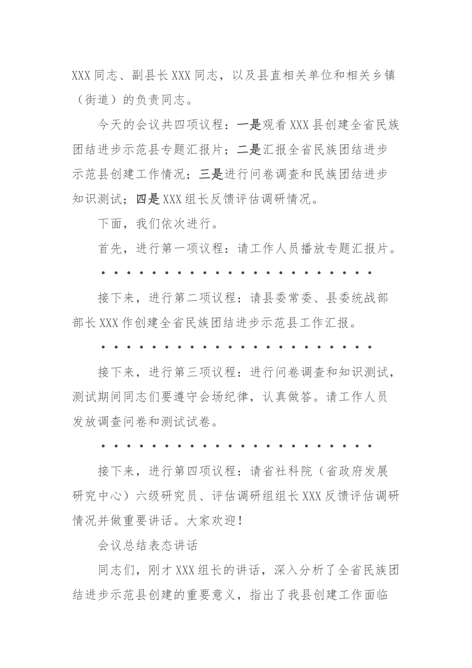 在 XXX 县创建全省民族团结进步示范县工作汇报会上的主持及表态讲话尊敬的 XXX 组长,各位领导和专家:从 7 月 20 日开始,省社科院评估调研组一行带着省社科院、省民宗委的关心和厚爱,顶着炎炎烈日莅临...