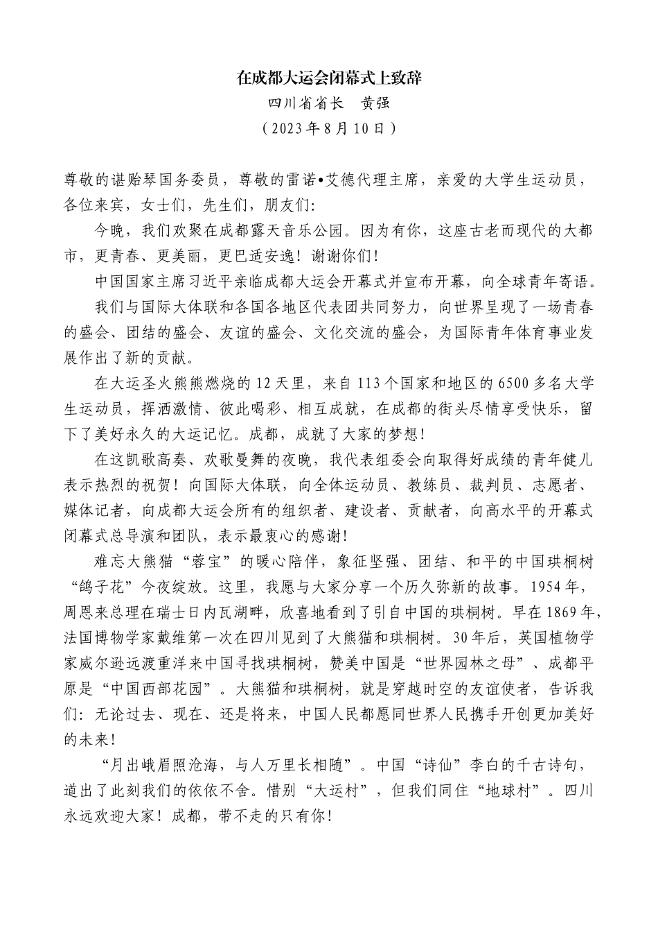 在成都大运会闭幕式上致辞四川省省长 黄强(2023 年 8 月 10 日)尊敬的谌贻琴国务委员,尊敬的雷诺 艾德代理主席,亲爱的大学生运动员,•各位来宾,女士们,先生们,朋友们:今晚,我们欢聚在成都露天音...