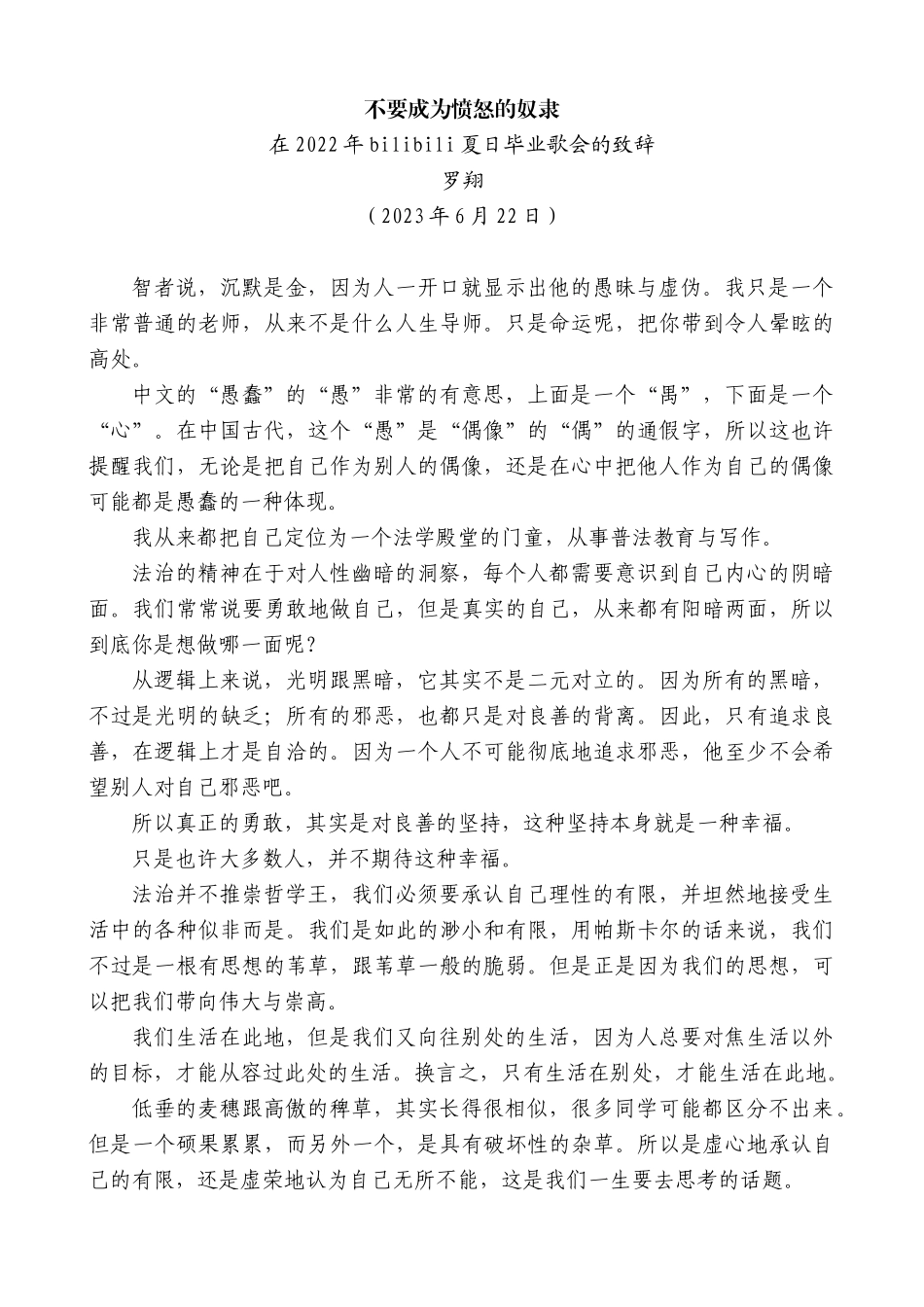 不要成为愤怒的奴隶在 2022 年 bilibili 夏日毕业歌会的致辞罗翔(2023 年 6 月 22 日)智者说,沉默是金,因为人一开口就显示出他的愚昧与虚伪。我只是一个非常普通的老师,从来不是什么人生导师。只是...