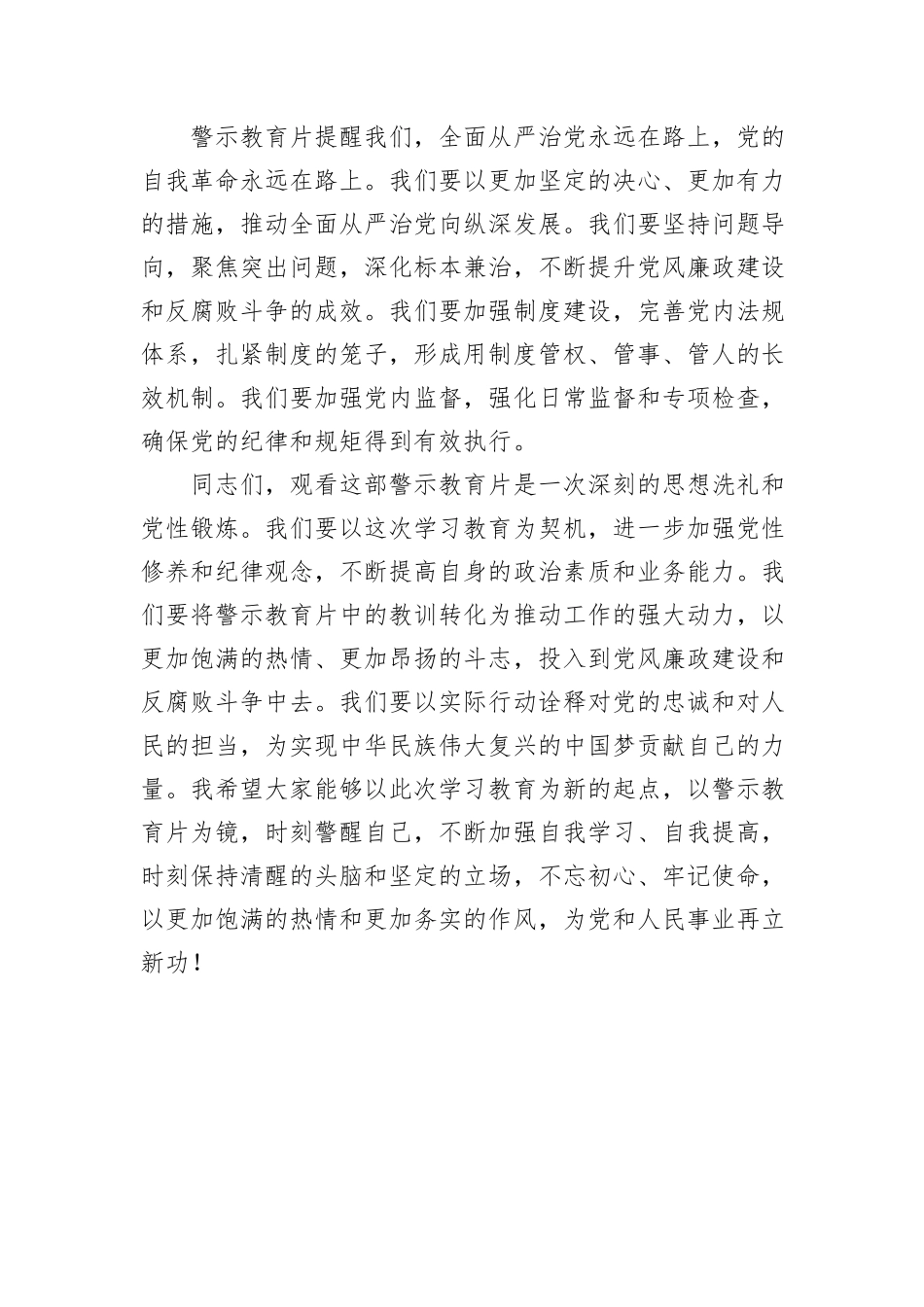 观看党纪学习教育警示教育片后的讲话今天我们在这里集中观看了一部关于党纪学习教育的警示教育片,这是一部生动而深刻的教材,它用真实的案例、鲜活的事实,给我们上了一堂深刻的思想政治课。在此,我谈几点个人...