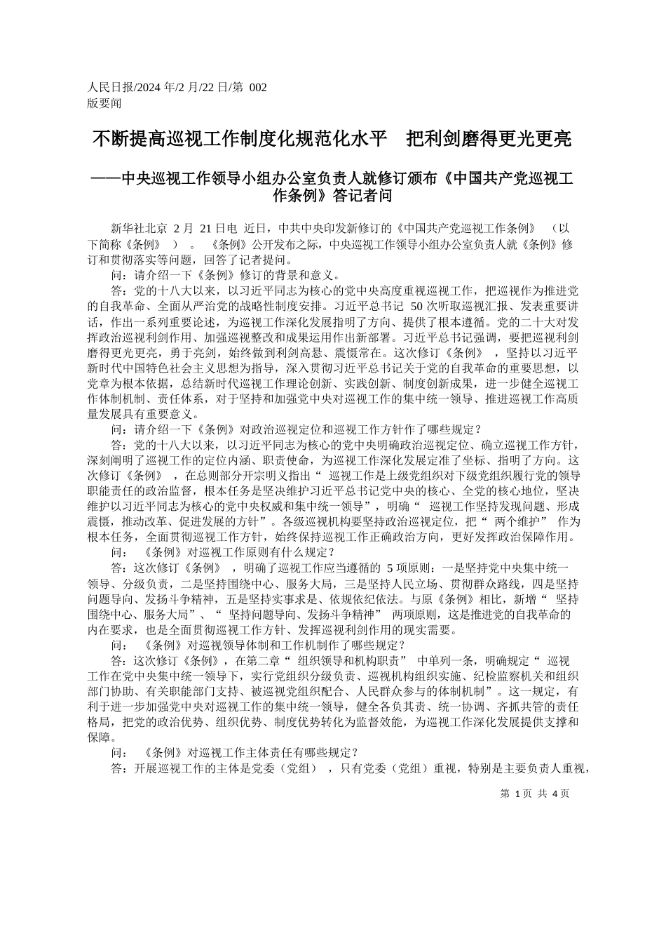 人民日报/2024 年/2 月/22 日/第 002 版要闻不断提高巡视工作制度化规范化水平 把利剑磨得更光更亮——中央巡视工作领导小组办公室负责人就修订颁布《中国共产党巡视工作条例》答记者问新华社北京 2 月 ...