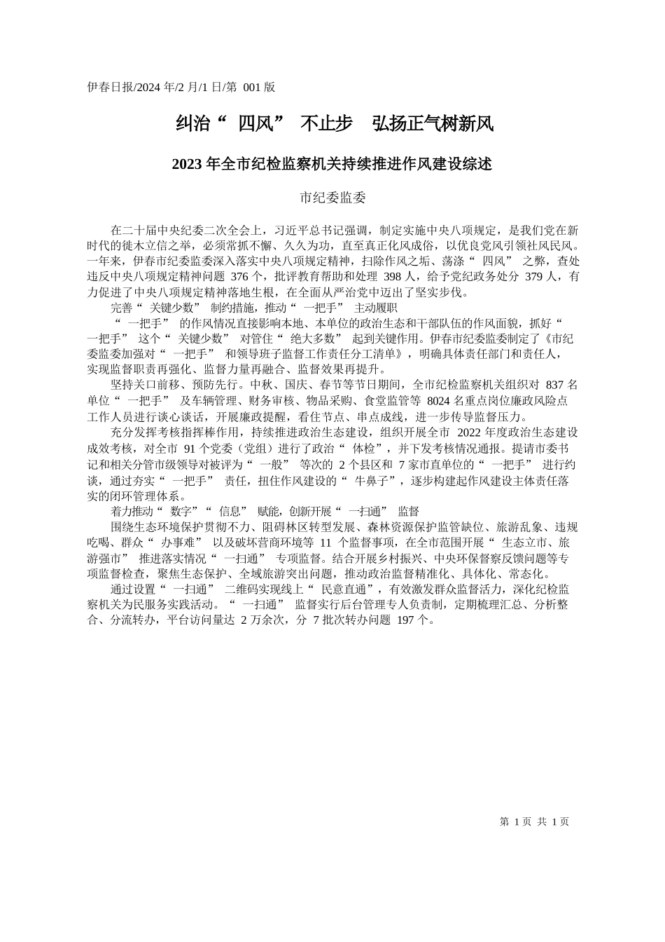 伊春日报/2024 年/2 月/1 日/第 001 版纠治“ 四风” 不止步 弘扬正气树新风2023 年全市纪检监察机关持续推进作风建设综述市纪委监委在二十届中央纪委二次全会上,习近平总书记强调,制定实施中央八项规...