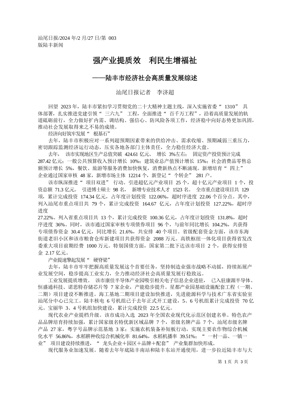 汕尾日报/2024 年/2 月/27 日/第 003 版陆丰新闻强产业提质效 利民生增福祉——陆丰市经济社会高质量发展综述汕尾日报记者 李济超回望 2023 年,陆丰市紧扣学习贯彻党的二十大精神主题主线,深入实施省...