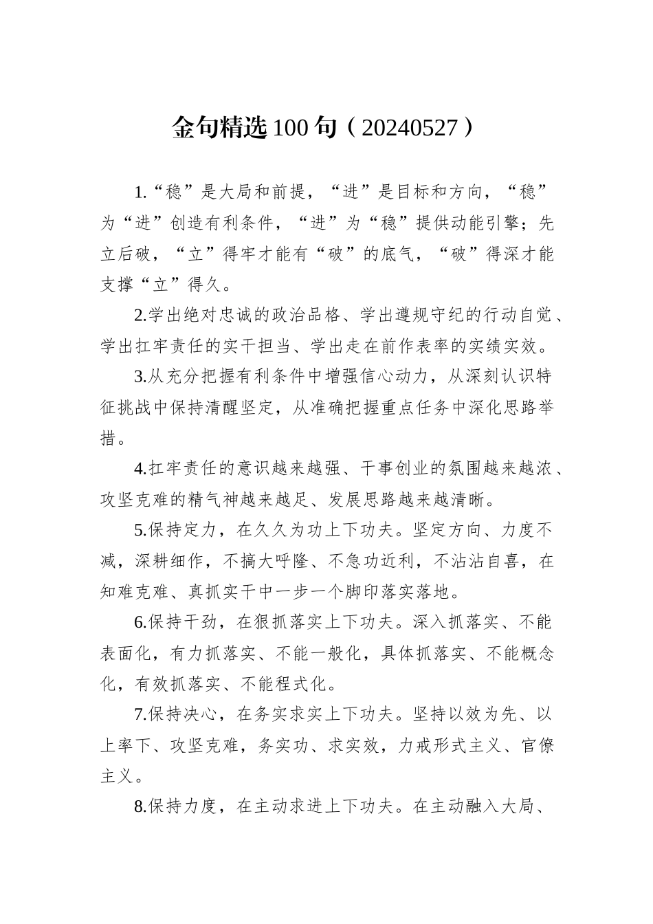 金句精选 100 句(20240527)1.“稳”是大局和前提,“进”是目标和方向,“稳”为“进”创造有利条件,“进”为“稳”提供动能引擎;先立后破,“立”得牢才能有“破”的底气,“破”得深才能支撑“立”得久。...