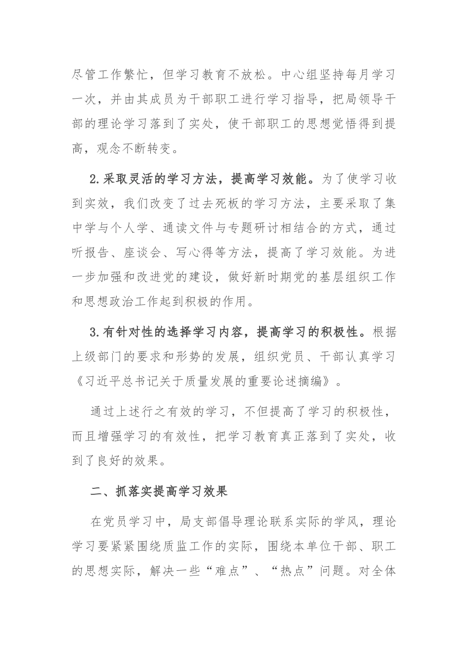 质监局党支部上半年工作总结上半年,***市质监局党支部在市委、市政府及局党组的正确领导下,以习近平新时代中国特色社会主义思想为指导,统一思想、凝聚力量、振奋精神,努力抓好物质文明、精神文明和党风廉政建...