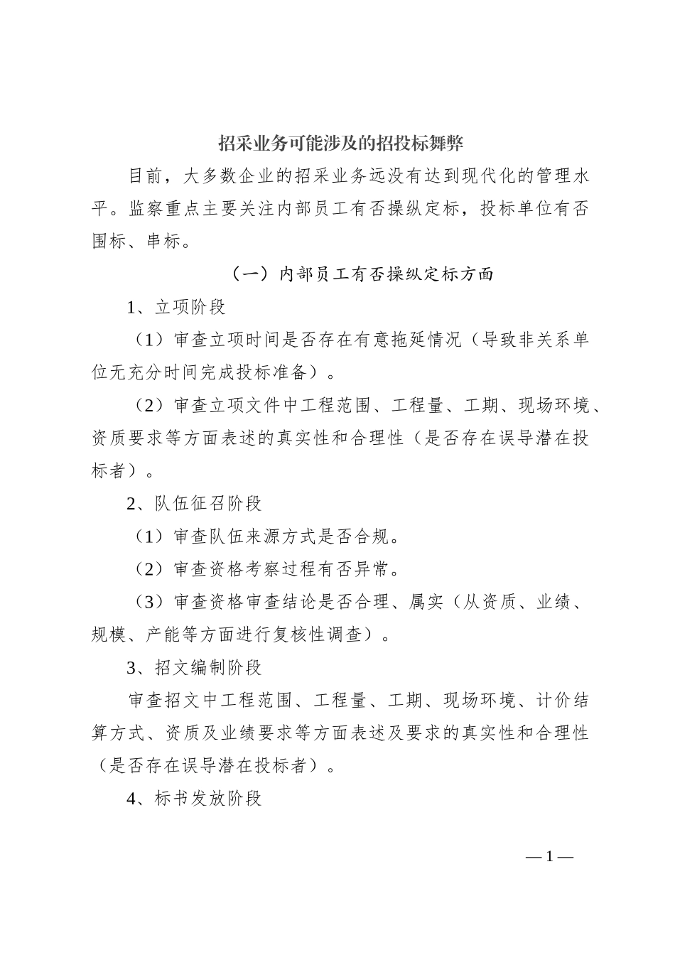 — 1 —招采业务可能涉及的招投标舞弊目前,大多数企业的招采业务远没有达到现代化的管理水平。监察重点主要关注内部员工有否操纵定标,投标单位有否围标、串标。(一)内部员工有否操纵定标方面1、立项阶段(1...