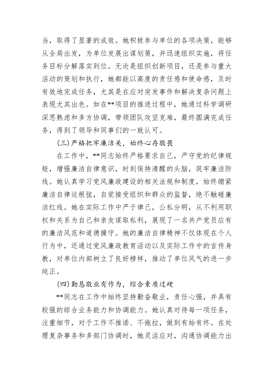 2024 干部考察现实表现材料一、基本情况***,女,汉族,**省**市人,出生于**年**月,**年*月参加工作,**年*月加入中国共产党,大学本科学历,现任**单位**职务。该同志自担任现职以来,始终保持着高度的政治敏...