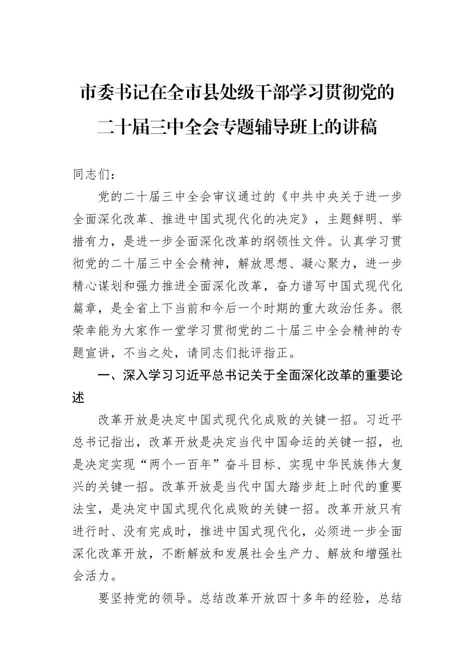 市委书记在全市县处级干部学习贯彻党的二十届三中全会专题辅导班上的讲稿_第1页
