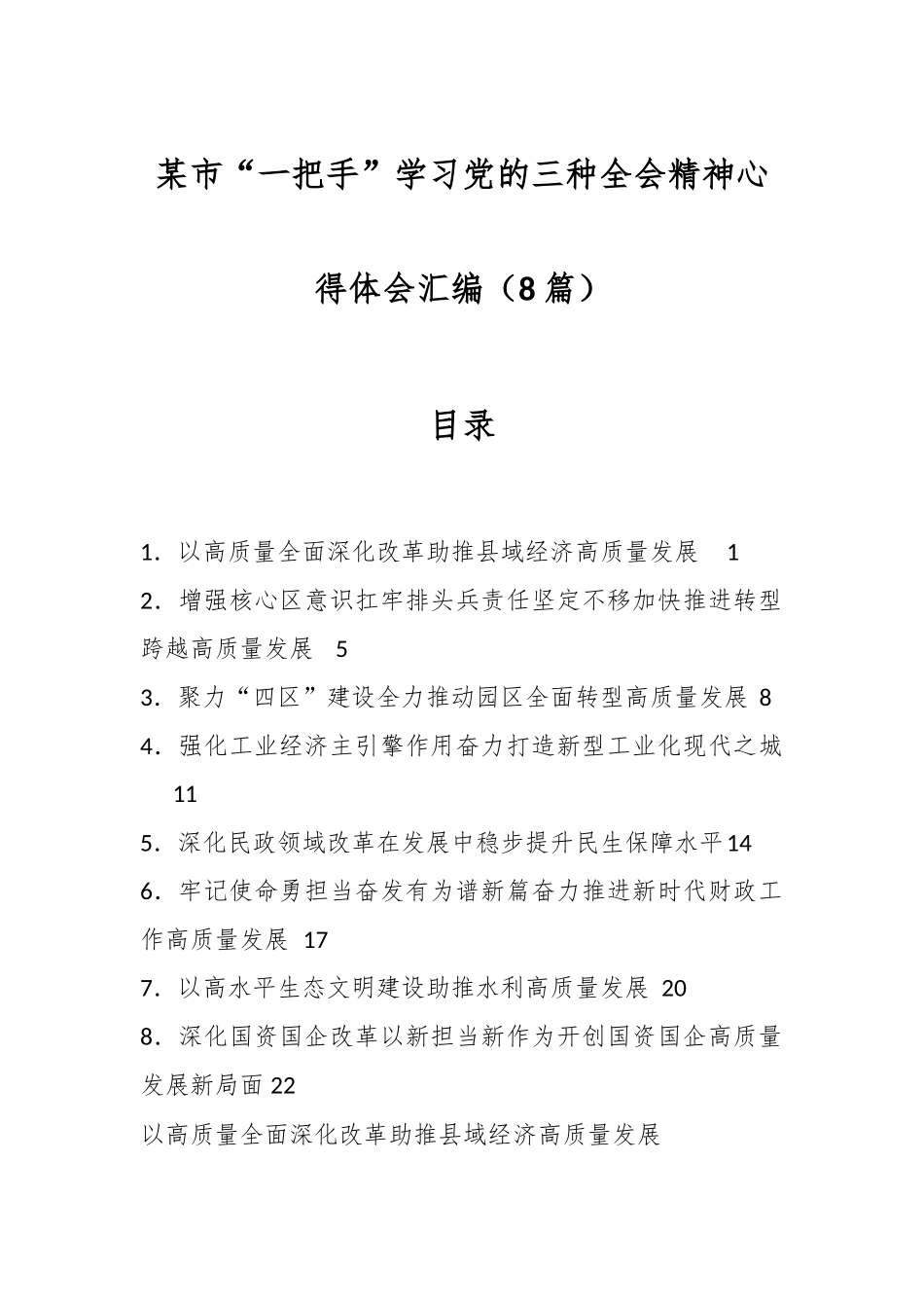 某市“一把手”学习党的三种全会精神心得体会汇编(8 篇)目录1.以高质量全面深化改革助推县域经济高质量发展12.增强核心区意识扛牢排头兵责任坚定不移加快推进转型跨越高质量发展53.聚力“四区”建设全力推...