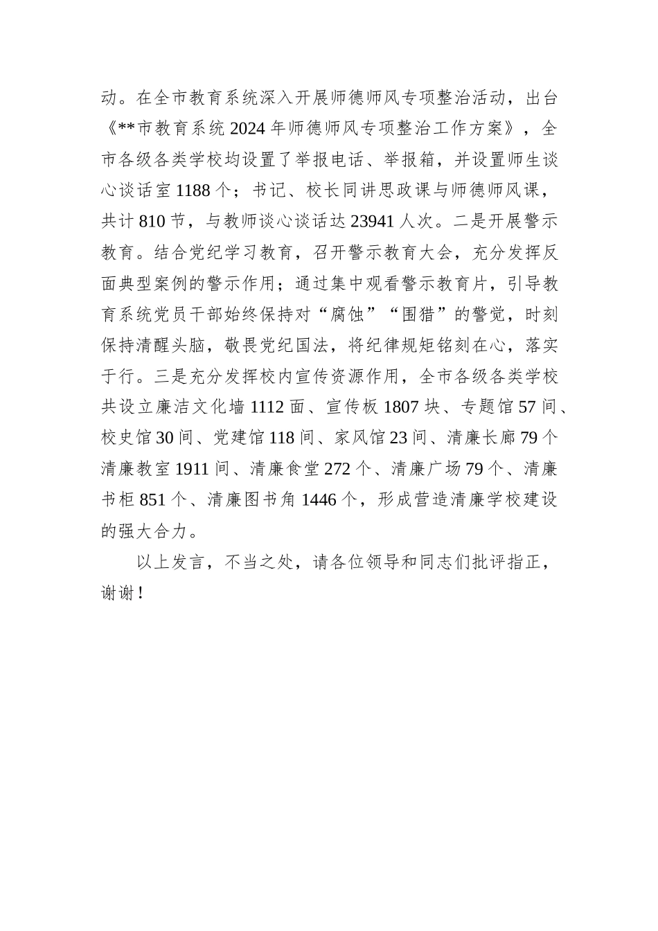 在2024年清廉校园建设评估验收工作现场会上的汇报发言