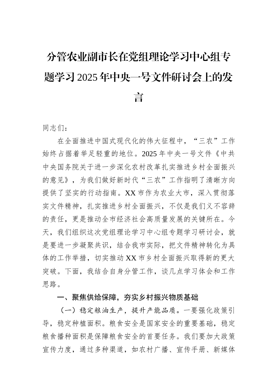分管农业副市长在党组理论学习中心组专题学习2025年中央一号文件研讨会上的发言_第1页