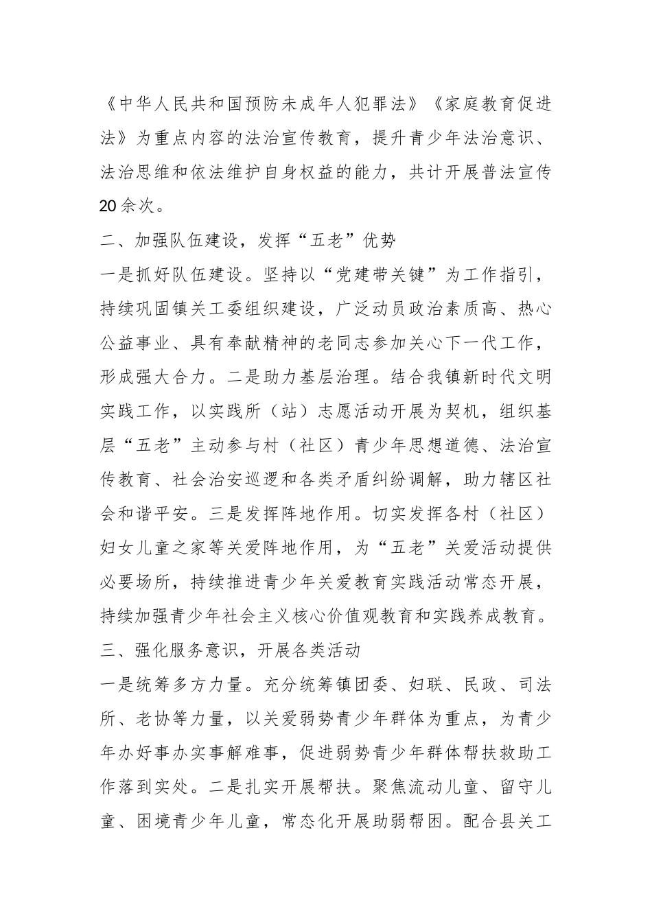 X 镇 2024 年度关心下一代工作情况总结2024 年来,我镇关工委在县关工委的精心指导下,在镇党委的坚强领导下,坚持以服务青少年为工作准则,以紧抓立德树人、助弱帮困、固本强基为工作重点,全面贯彻落实县委...