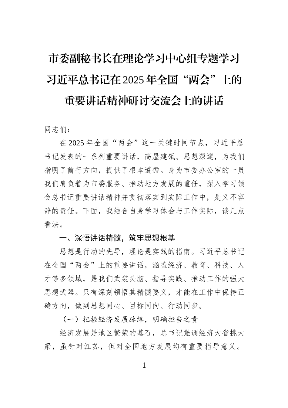 市委副秘书长在理论学习中心组专题学习习近平总书记在2025年全国“两会”上的重要讲话精神研讨交流会上的讲话_第1页