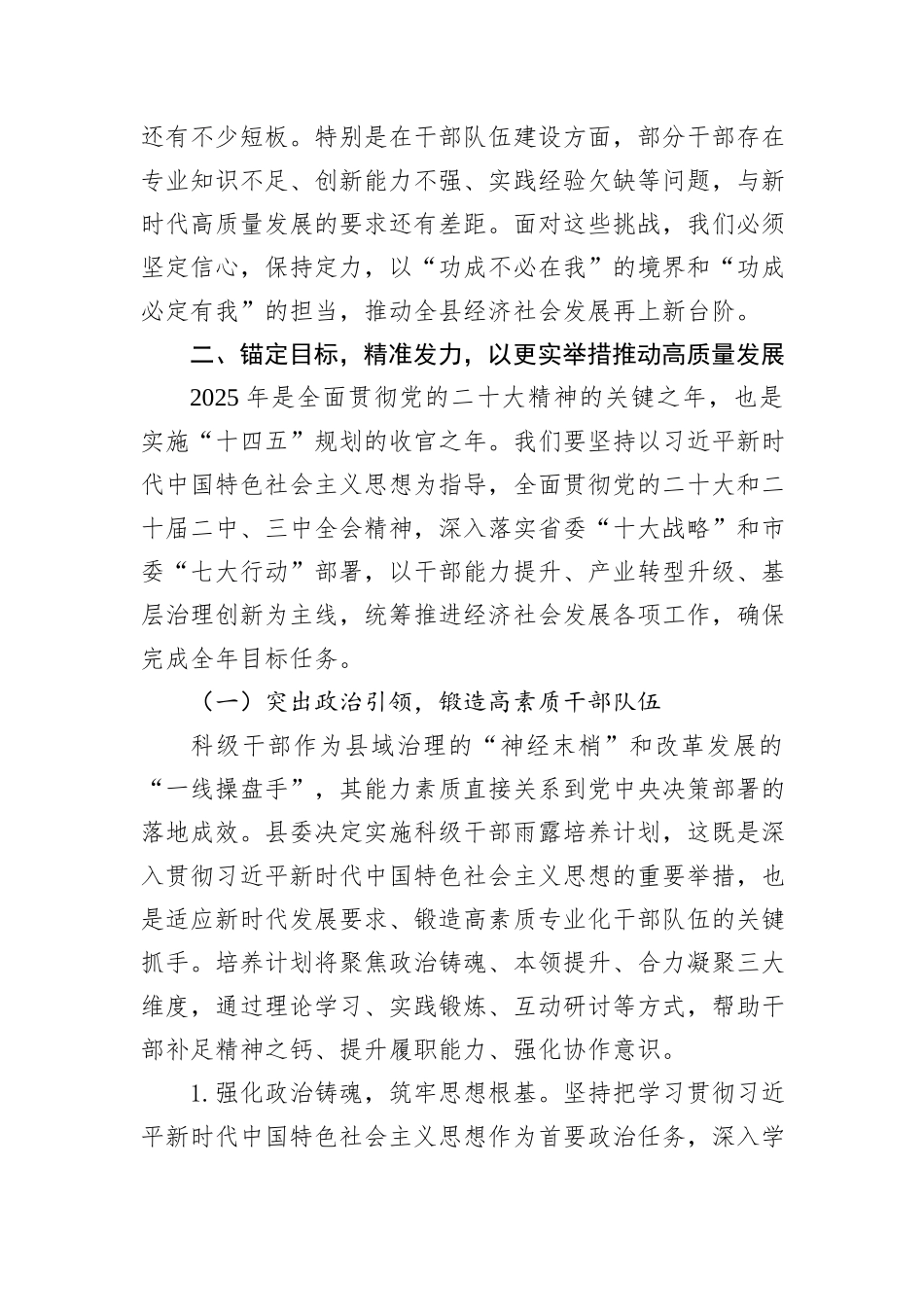 在全县三级干部会议上的讲话提纲同志们:今天,我们在这里召开全县三级干部会议,这既是一次收心归位的动员会,更是一次加压鼓劲的誓师会。刚才,我们表彰了过去一年在各条战线上涌现出的先进集体和个人,几位同...